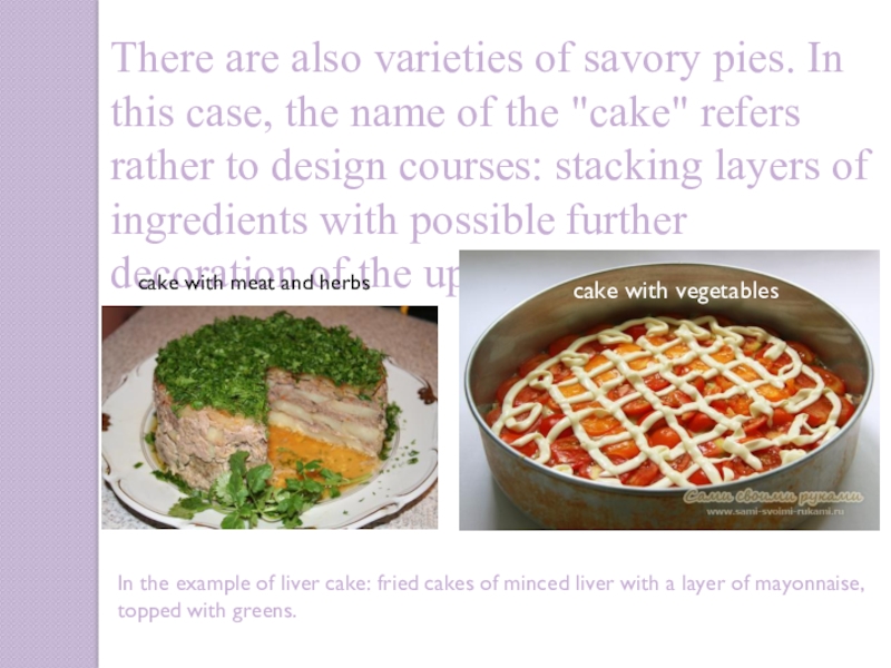 In the example of liver cake: fried cakes of minced liver with a layer of mayonnaise, topped with greens.