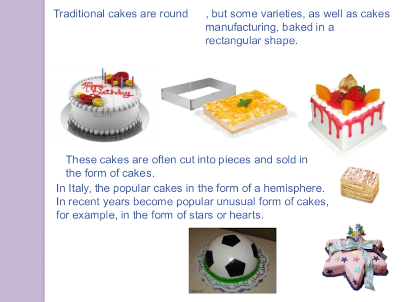 In Italy, the popular cakes in the form of a hemisphere. In recent years become popular unusual form of cakes, for example, in the form of stars or hearts.