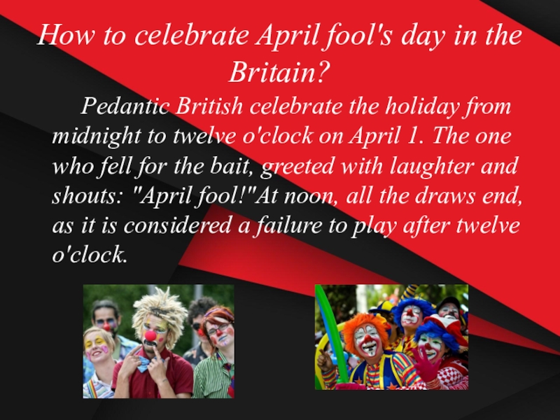 How to celebrate April fool's day in the Britain? Pedantic British celebrate the holiday from midnight to twelve o'clock on April 1. The one who fell for the bait, greeted with laughter and