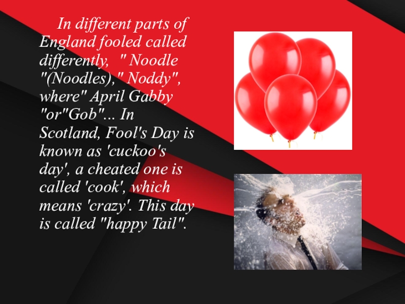 differently, " Noodle "(Noodles)," Noddy", where" April Gabby "or"Gob"... In Scotland, Fool's Day is known as 'cuckoo's day', a cheated one is called 'cook', which means 'crazy'. This day is called "happy Tail".