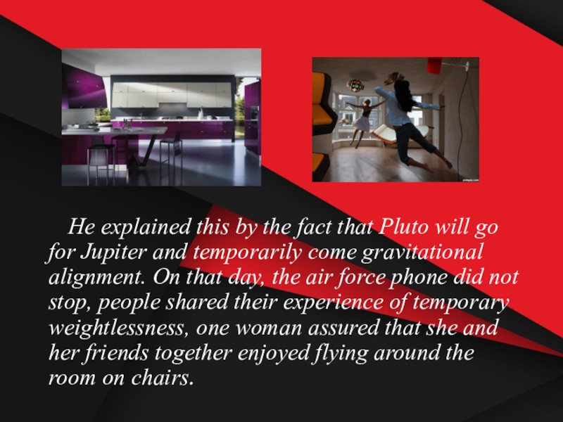 Pluto will go for Jupiter and temporarily come gravitational alignment. On that day, the air force phone did not stop, people shared their experience of temporary weightlessness, one woman assured that she and her friends together enjoyed flying around the room on chairs.
