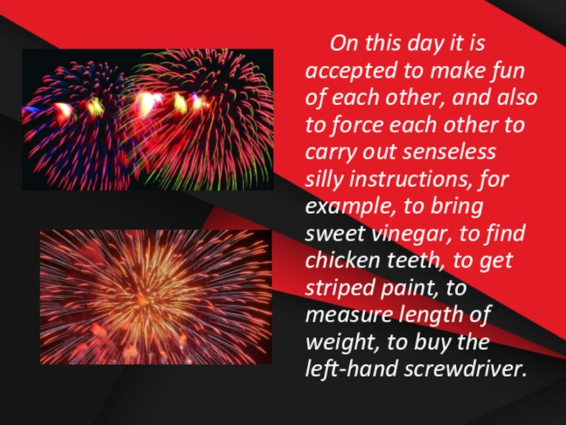 make fun of each other, and also to force each other to carry out senseless silly instructions, for example, to bring sweet vinegar, to find chicken teeth, to get striped paint, to measure length of weight, to buy the left-hand screwdriver.