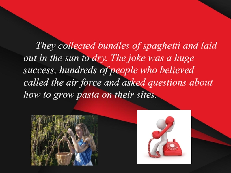 laid out in the sun to dry. The joke was a huge success, hundreds of people who believed called the air force and asked questions about how to grow pasta on their sites.