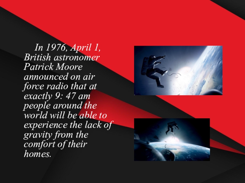In 1976, April 1, British astronomer Patrick Moore announced on air force radio