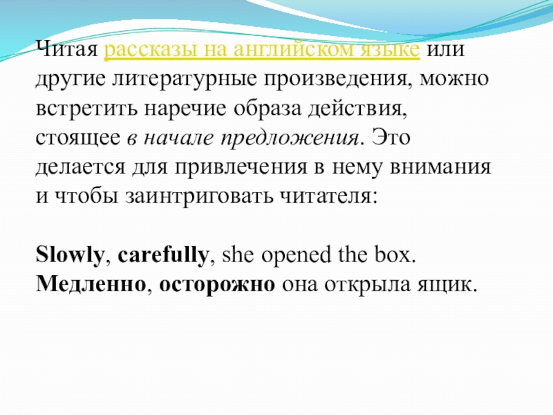 Читая рассказы на английском языке или другие литературные произведения, можно встретить наречие образа действия, стоящее в начале предложения. Это делается для