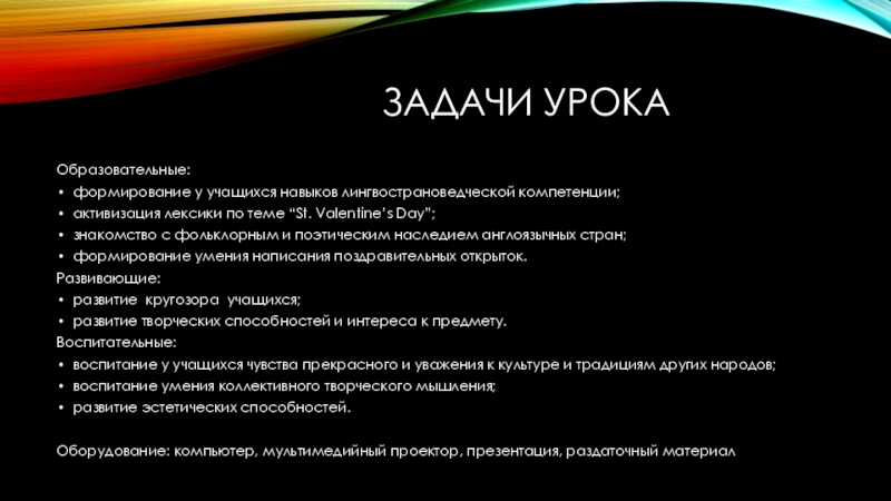 Задачи урокаОбразовательные:формирование у учащихся навыков лингвострановедческой компетенции;активизация лексики по теме “St. Valentine’s Day”;знакомство с фольклорным и поэтическим