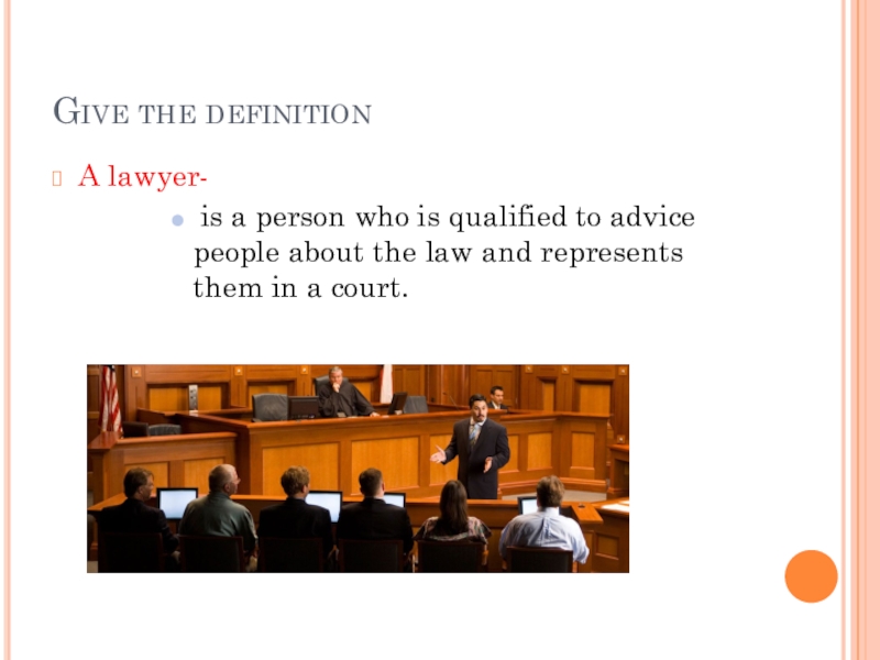 Give the definitionA lawyer- is a person who is qualified to advice people about the law and