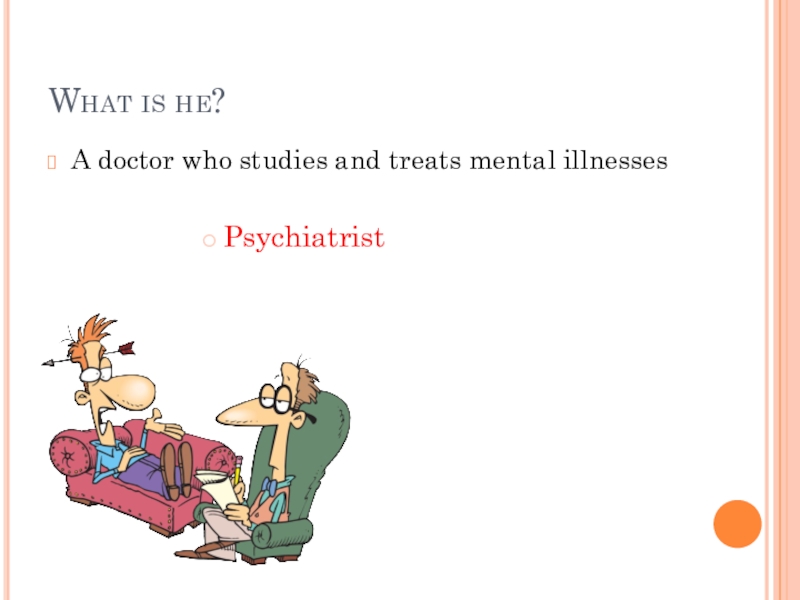 What is he?A doctor who studies and treats mental illnessesPsychiatrist