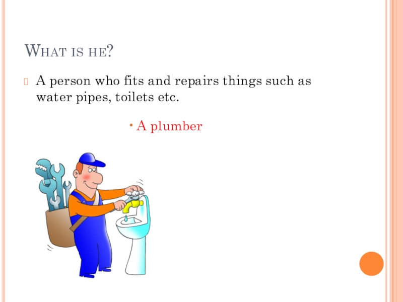 What is he?A person who fits and repairs things such as water pipes, toilets etc.A plumber