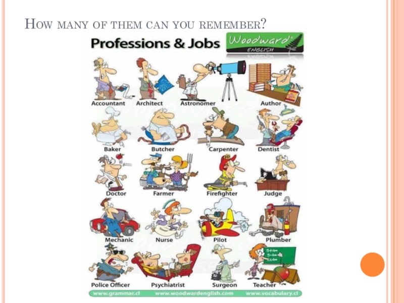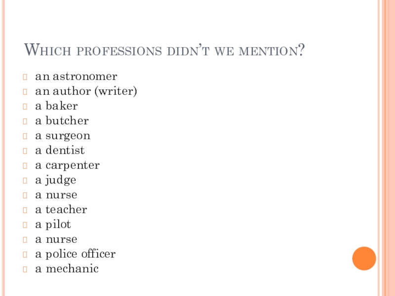 Which professions didn’t we mention?an astronomeran author (writer)a bakera butchera surgeona dentista carpentera judgea nursea teachera pilota