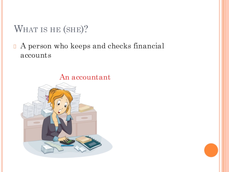What is he (she)?A person who keeps and checks financial accounts				An accountant