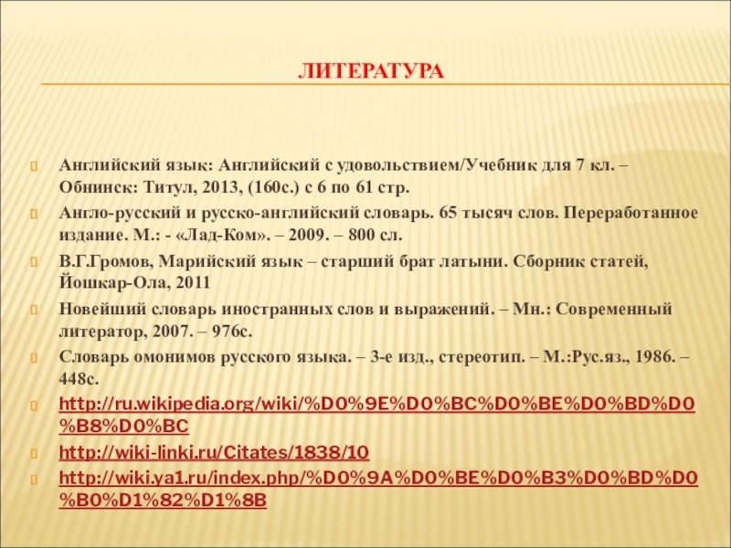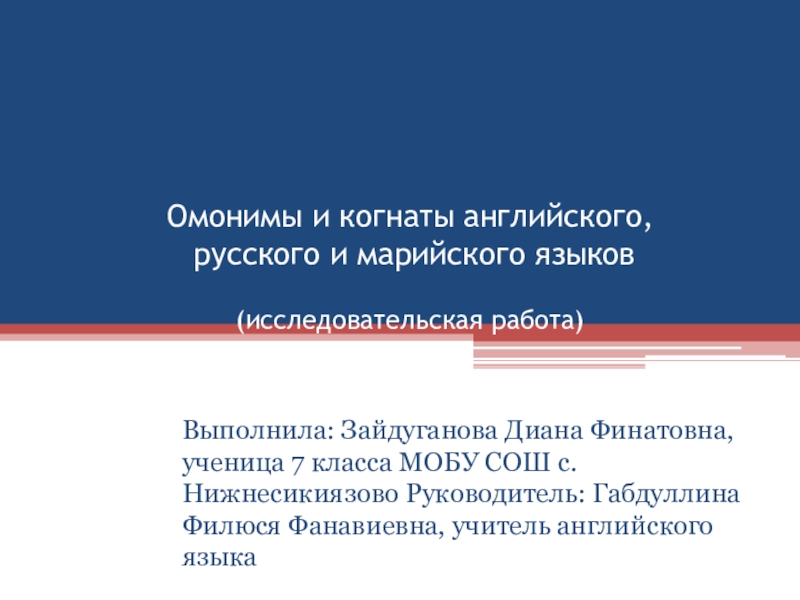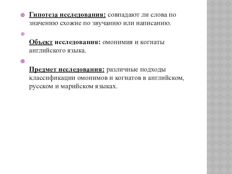 Предмет исследования: различные подходы классификации омонимов и когнатов в английском, русском и марийском языках.