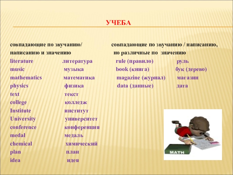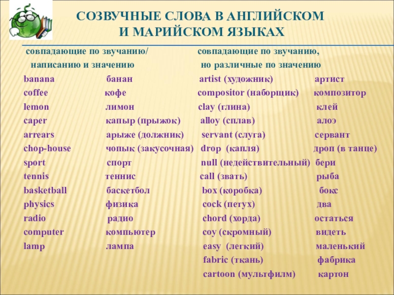 сравнить значение созвучных английских и русских слов, английских и марийских слов.