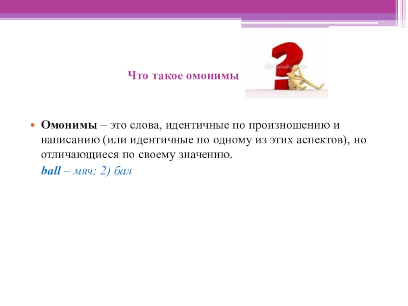 это слова, идентичные по произношению и написанию (или идентичные по одному из этих аспектов), но отличающиеся по своему значению.