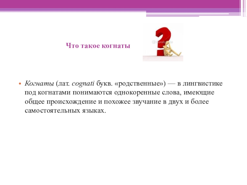 когнатами понимаются однокоренные слова, имеющие общее происхождение и похожее звучание в двух и более самостоятельных языках.