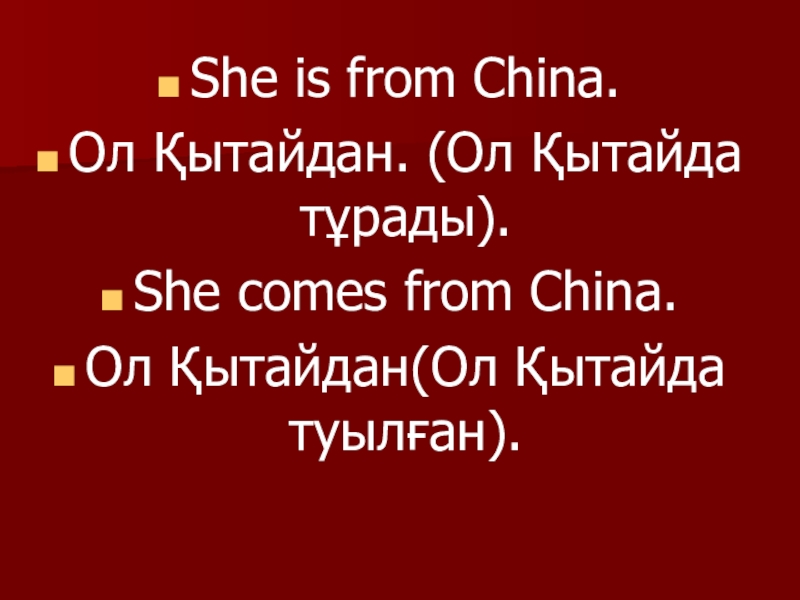 She is from China. Ол Қытайдан. (Ол Қытайда тұрады).She comes from China. Ол Қытайдан(Ол Қытайда туылған).