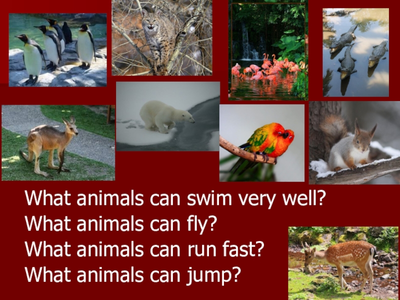 What animals can swim very well?What animals can fly?What animals can run fast?What animals can jump?