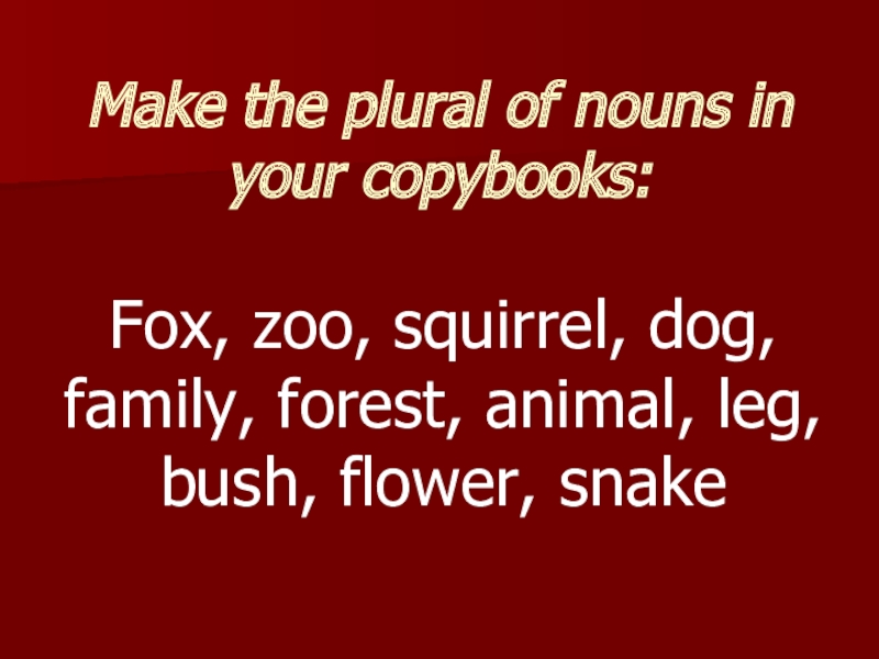 Make the plural of nouns in your copybooks: Fox, zoo, squirrel, dog, family, forest, animal, leg, bush,