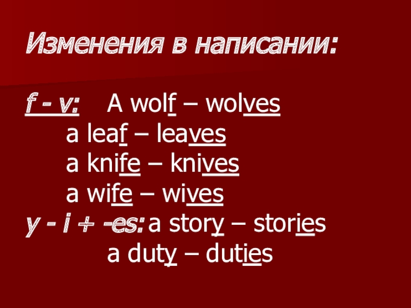 Изменения в написании: f - v: 	A wolf – wolves 		a leaf – leaves		a knife – knives		a