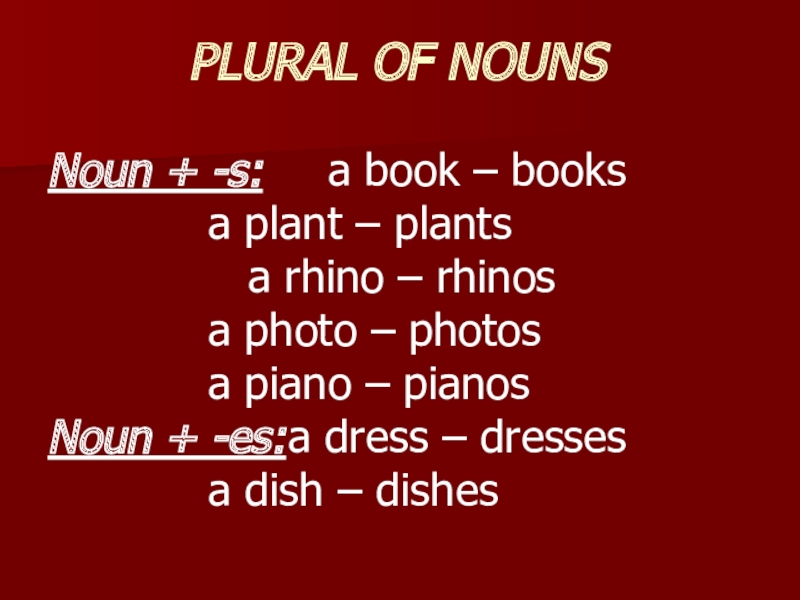 PLURAL OF NOUNSNoun + -s:		a book – books				a plant – plants			a rhino – rhinos				a photo – photos				a