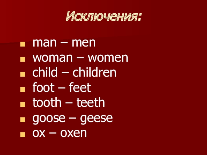 Исключения: man – men woman – women child – children foot – feet tooth – teeth goose