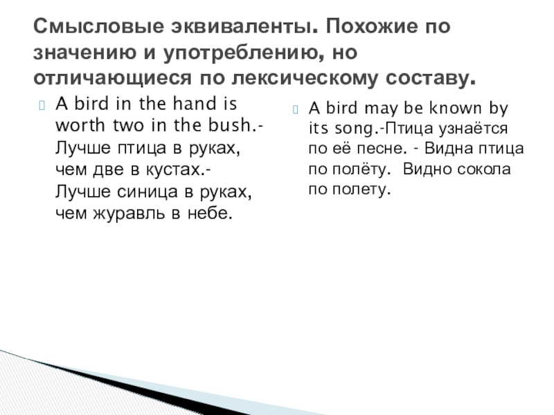 Смысловые эквиваленты. Похожие по значению и употреблению, но отличающиеся по лексическому составу.