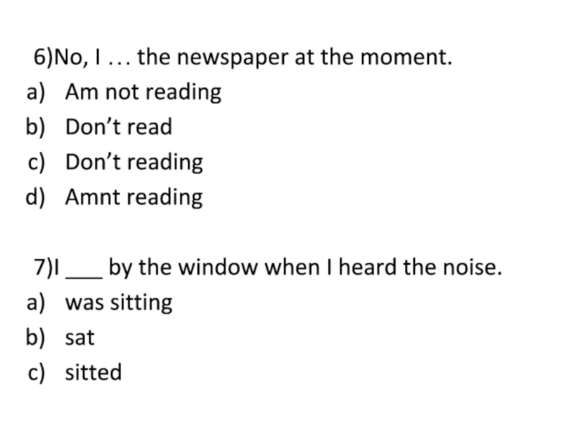 6)No, I … the newspaper at the moment.Am not readingDon’t readDon’t readingAmnt reading 7)I ___ by the window