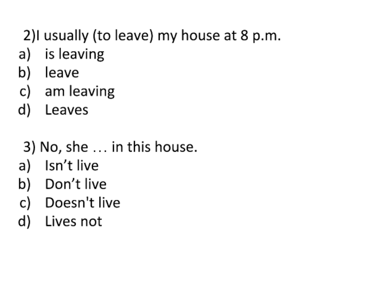 2)I usually (to leave) my house at 8 p.m.is leavingleaveam leavingLeaves3) No, she … in this house.Isn’t liveDon’t liveDoesn't liveLives not