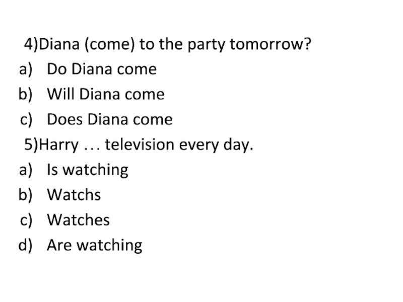 4)Diana (come) to the party tomorrow?Do Diana comeWill Diana comeDoes Diana come5)Harry … television every day.Is watchingWatchsWatchesAre