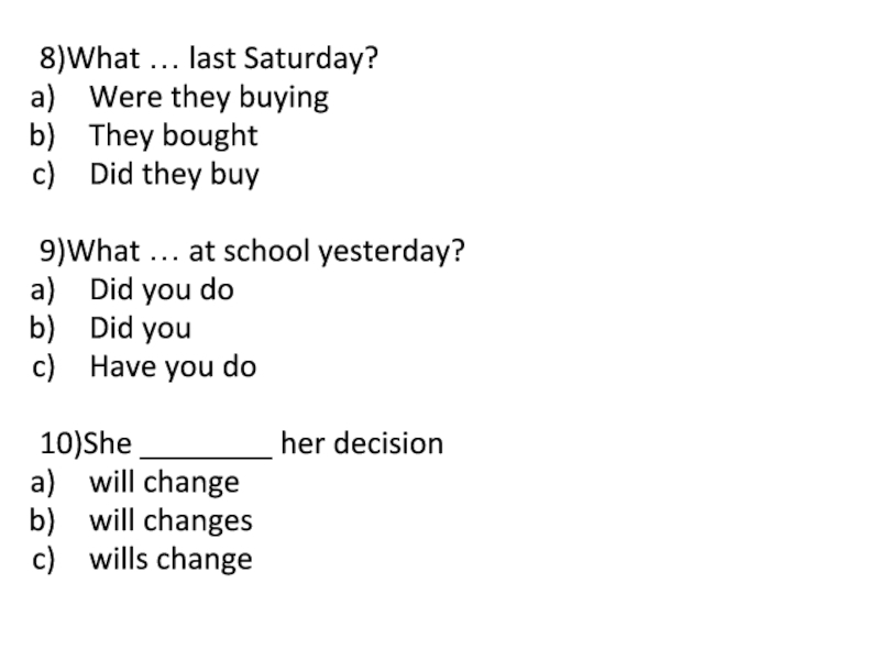 8)What … last Saturday?Were they buying They boughtDid they buy 9)What … at school yesterday? Did you doDid