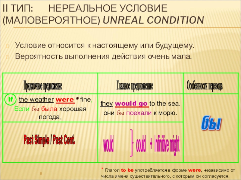 * Глагол to be употребляется в форме were, независимо от числа имени существительного, с которым он согласуется.