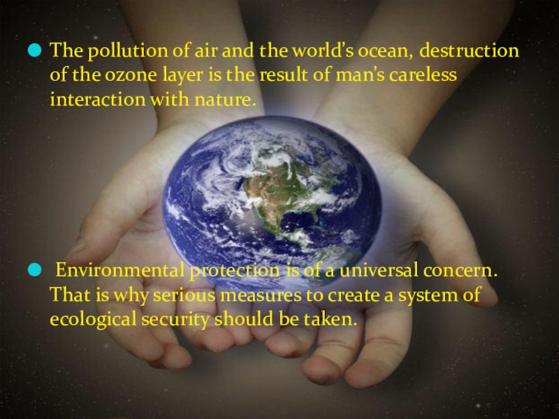 Слайд 7The pollution of air and the world’s ocean, destruction of the