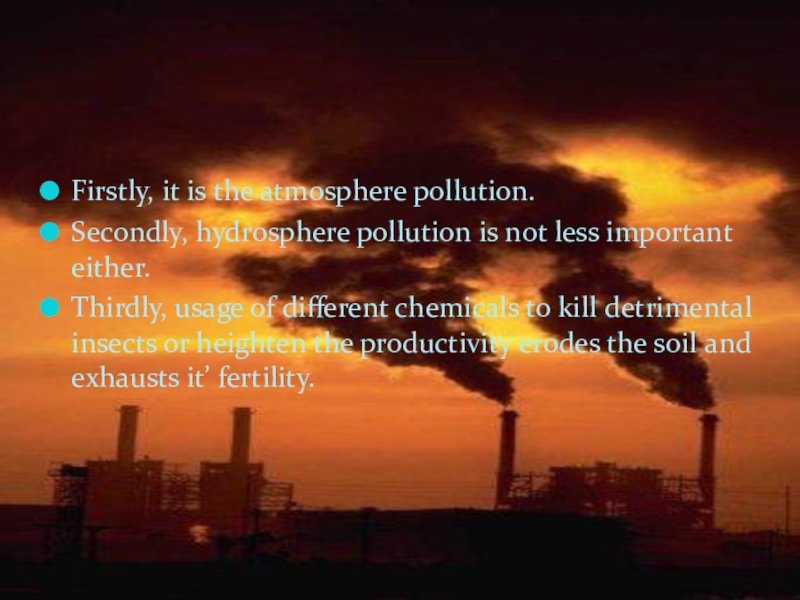Firstly, it is the atmosphere pollution. Secondly, hydrosphere pollution is not less important either. Thirdly, usage of