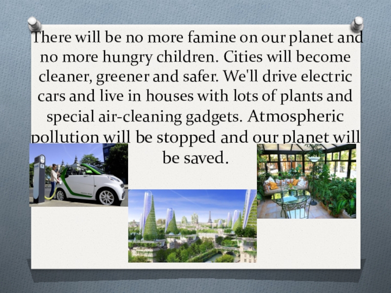more hungry children. Cities will become cleaner, greener and safer. We'll drive electric cars and live in houses with lots of plants and special air-cleaning gadgets. Atmospheric pollution will be stopped and our planet will be saved.