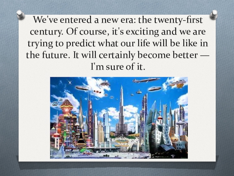 We've entered a new era: the twenty-first century. Of course, it's exciting and we are trying to predict what our life will be like in the future. It will certainly become better — I'm sure of