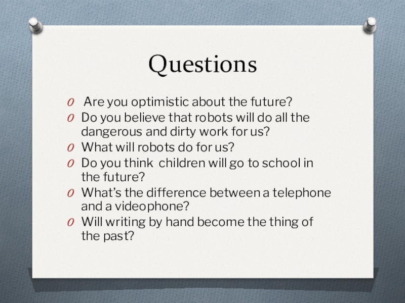 Questions Are you optimistic about the future?Do you believe that robots will do all the dangerous and
