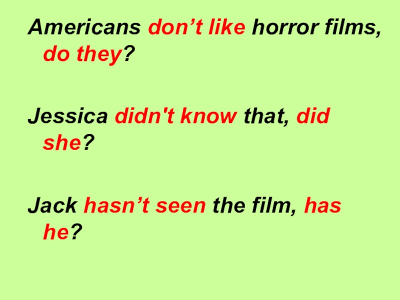 Americans don’t like horror films, do they?Jessica didn't know that, did she?Jack hasn’t seen the film, has