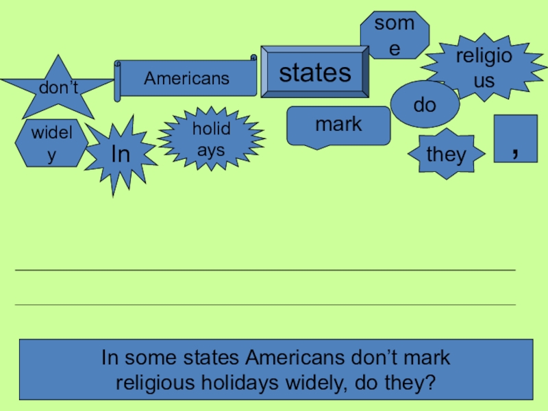 Insomedon’tstatesAmericansmarkreligiousholidayswidelydo,theyIn some states Americans don’t mark religious holidays widely, do they?Make up a sentence.
