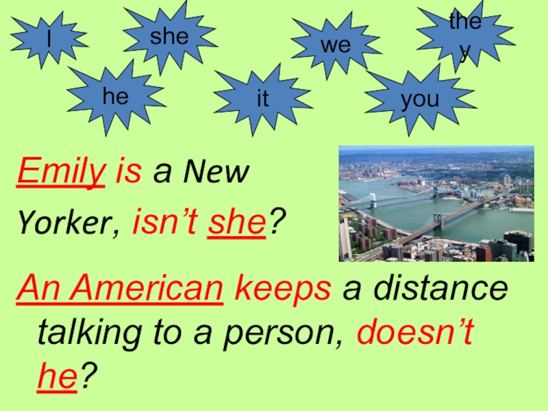 Emily is a New Yorker, isn’t she?An American keeps a distance talking to a person, doesn’t he?Ihesheitweyouthey