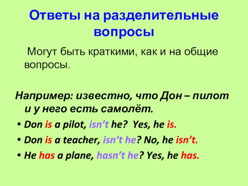 Ответы на разделительные вопросы	Могут быть краткими, как и на общие вопросы.Например: известно, что Дон – пилот и