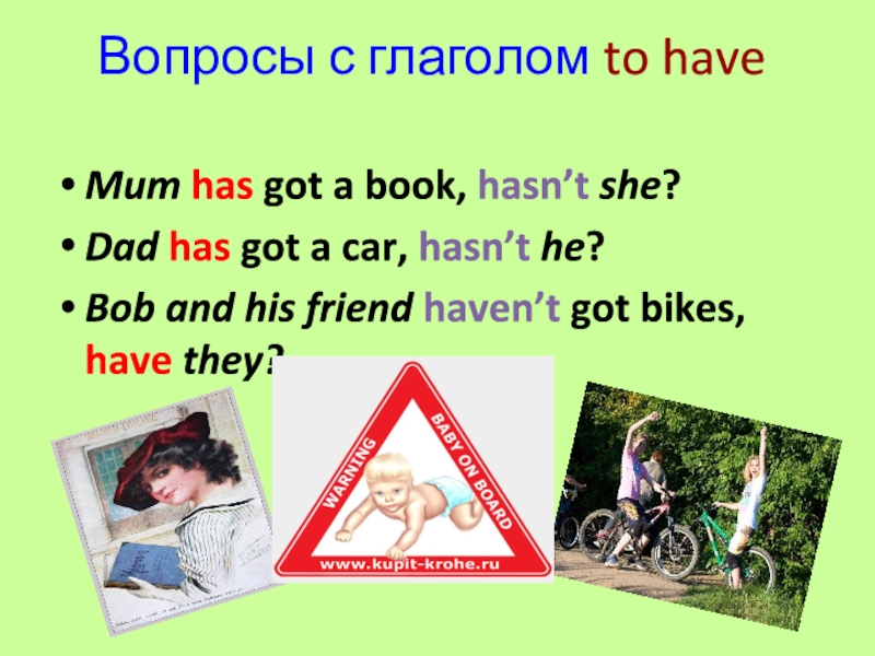 Вопросы с глаголом to haveMum has got a book, hasn’t she?Dad has got a car, hasn’t he?Bob