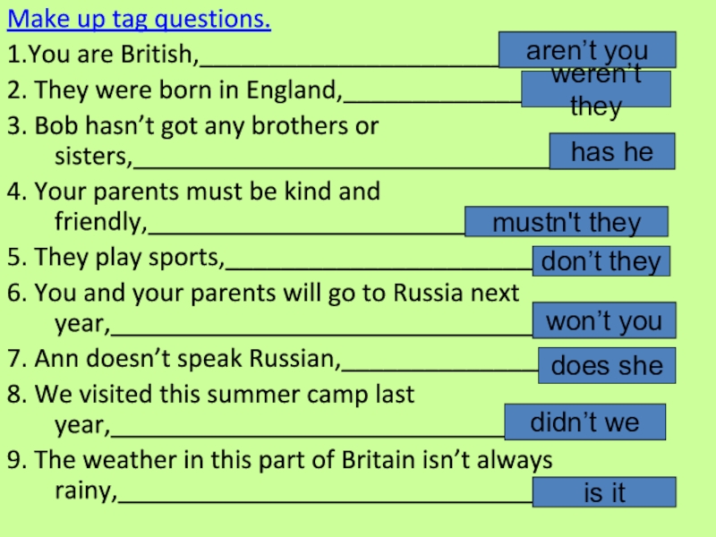 Make up tag questions.1.You are British,______________________________?2. They were born in England,____________________?3. Bob hasn’t got any brothers or