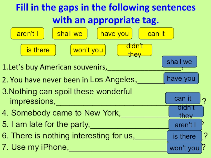 Fill in the gaps in the following sentences with an appropriate tag.1.Let’s buy American souvenirs,__________________?2. You have
