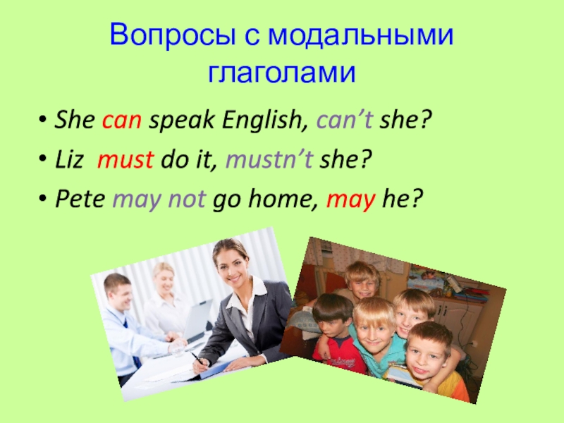Вопросы с модальными глаголамиShe can speak English, can’t she?Liz must do it, mustn’t she?Pete may not go