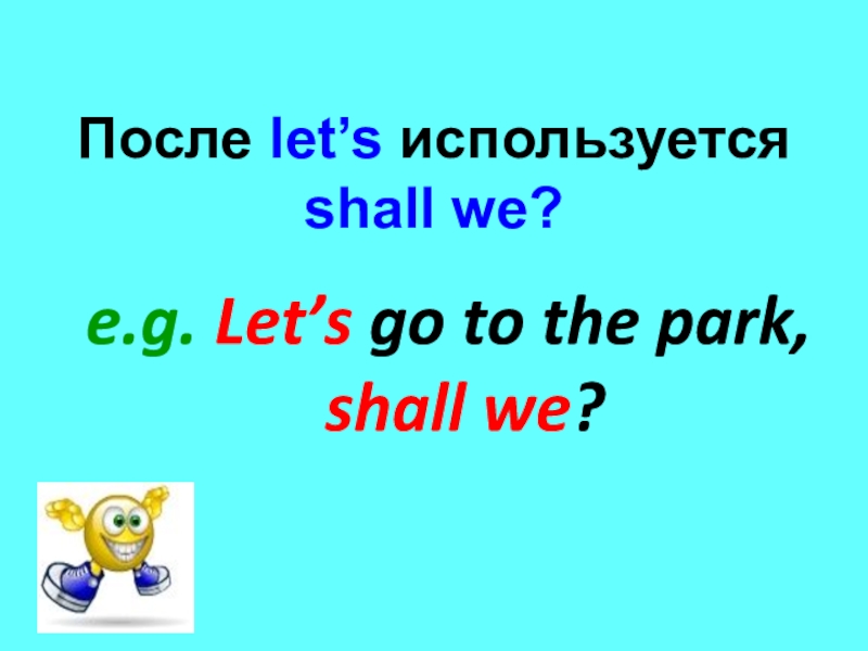 После let’s используется shall we?e.g. Let’s go to the park, shall we?