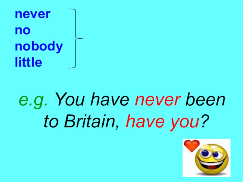 never no nobody littlee.g. You have never been to Britain, have you?утвердительное окончание