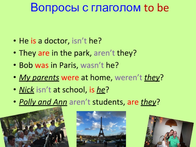Вопросы с глаголом to beHe is a doctor, isn’t he?They are in the park, aren’t they?Bob was