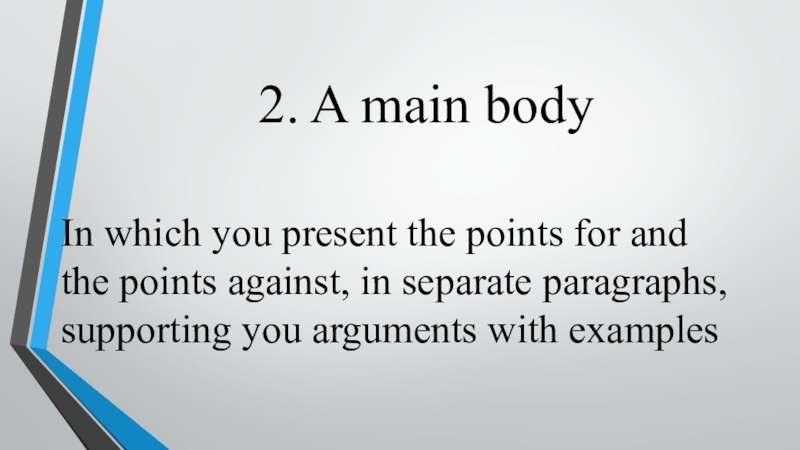 2. A main bodyIn which you present the points for and the points against, in separate paragraphs,