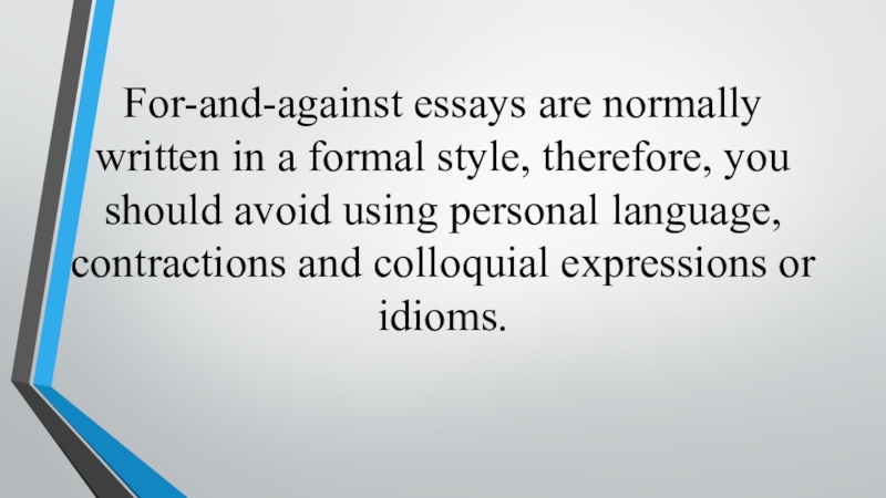 Слайд 7For-and-against essays are normally written in a formal style, therefore, you