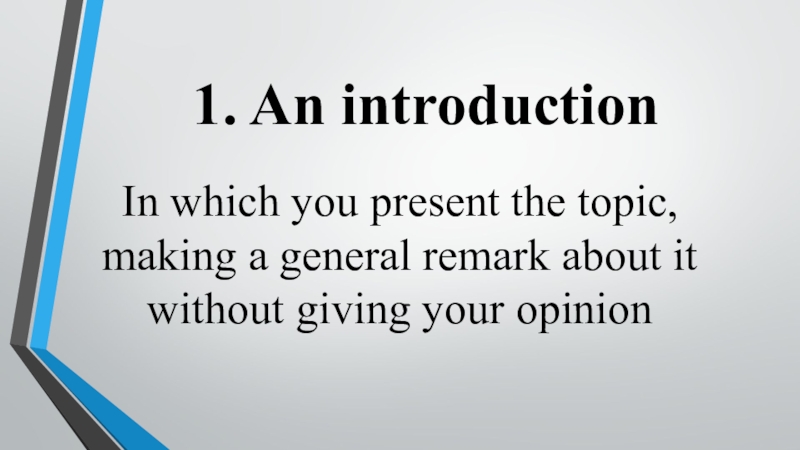 1. An introductionIn which you present the topic, making a general remark about it without giving your
